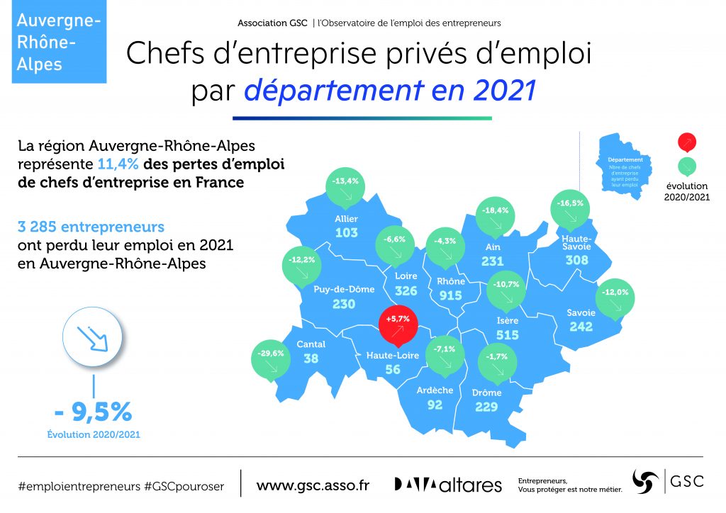 L’association GSC et la société Altares dévoilent la 6ème édition de l’Observatoire de l’emploi des entrepreneurs. Les chiffres 2021 de l’Observatoire en Auvergne-Rhône-Alpes révèlent qu’en 2021, 3 285 femmes et hommes chefs d’entreprise ont perdu leur activité professionnelle en Auvergne-Rhône-Alpes, une diminution de 9,5 % par rapport à l’année 2020.