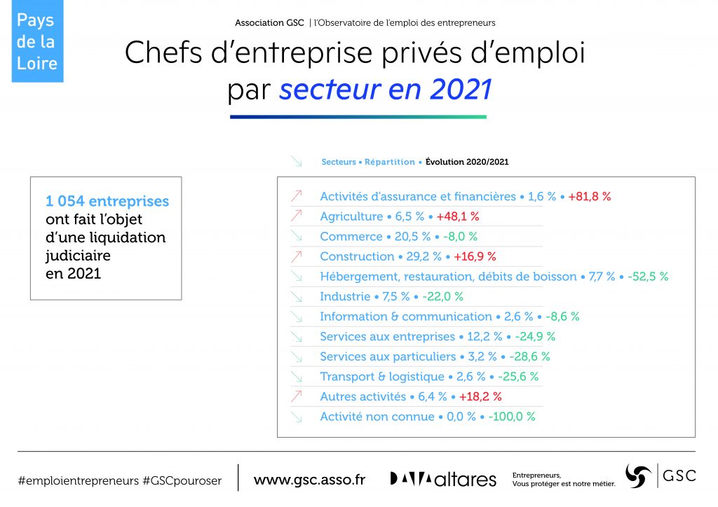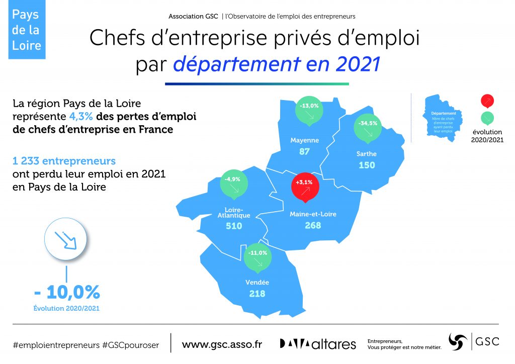 L’association GSC et la société Altares dévoilent la 6ème édition de l’Observatoire de l’emploi des entrepreneurs. Les chiffres 2021 de l’Observatoire en Pays de la Loire révèlent qu’en 2021, 1 233 femmes et hommes chefs d’entreprise ont perdu leur activité professionnelle en région Pays de la Loire. Ce chiffre représente une diminution de 10 % par rapport à l’année 2020.