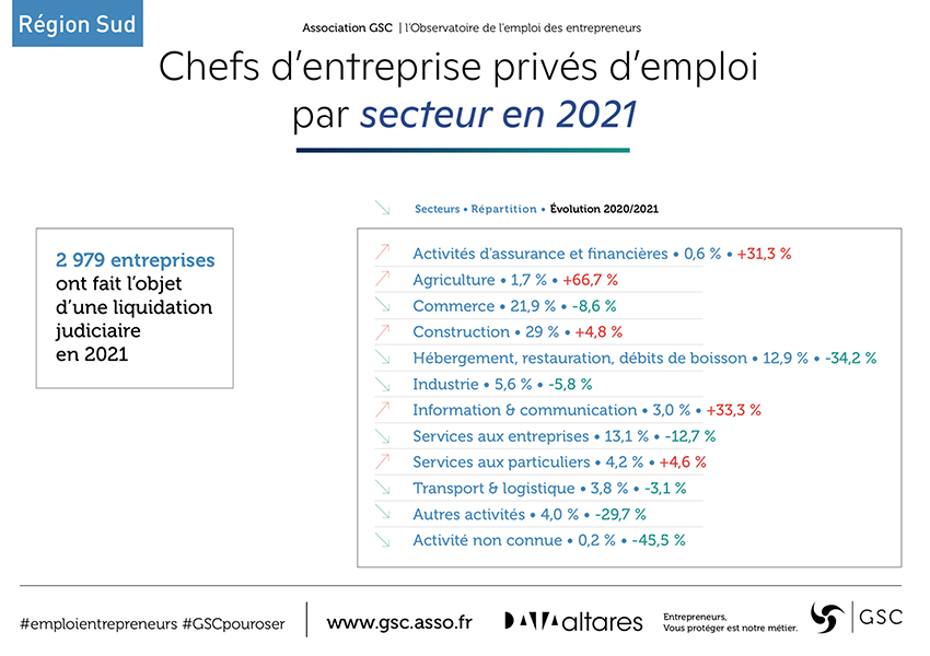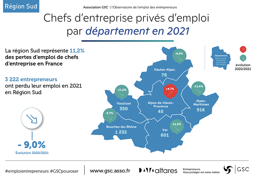 Chiffres de l’Observatoire 2021 en région Sud : l’association GSC et la société Altares dévoilent la 6ème édition de l’Observatoire de l’emploi des entrepreneurs. En 2021, 3 222 femmes et hommes chefs d’entreprise ont perdu leur activité professionnelle en région Sud – Provence-Alpes-Côte-d’Azur, une diminution de 9 % par rapport à l’année 2020.