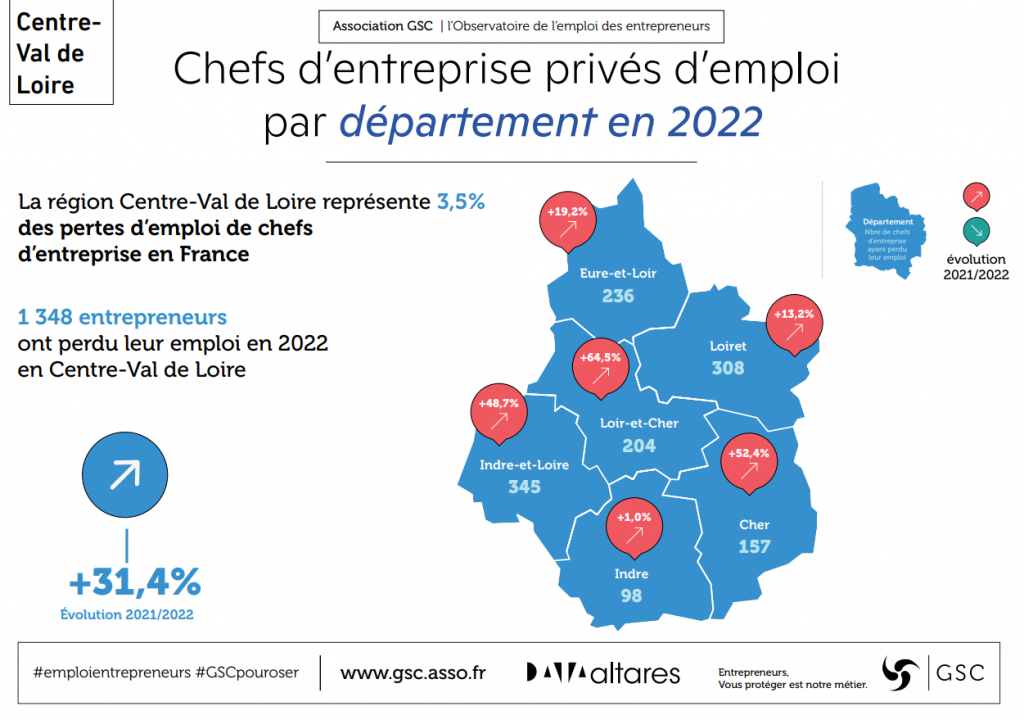Tous les départements de la région Centre-Val de Loire enregistrent une hausse du nombre d’entrepreneurs en situation de perte d’emploi. Le département de l’Indre-et-Loire, avec 345 chefs d’entreprise impactés, est le département le plus touché par les pertes d’emploi dans la région.