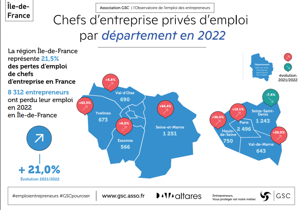 En 2022, 8 312 chefs d’entreprise ont perdu leur activité professionnelle en région Île-de-France selon l’Observatoire de l’emploi des entrepreneurs de l’association GSC et la société Altares. Ce chiffre, en hausse de 21 % par rapport à 2021, représente 1 440 femmes et hommes impactés de plus sur un an.