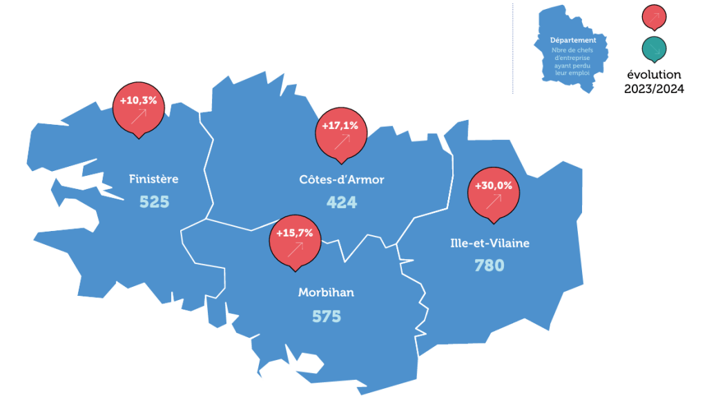 L’Ille-et-Vilaine est le département le plus touché, avec 780 chefs d’entreprise ayant perdu leur emploi, soit une hausse de 30 %. Dans le Morbihan, 575 entrepreneurs sont concernés (+ 15,7 %).