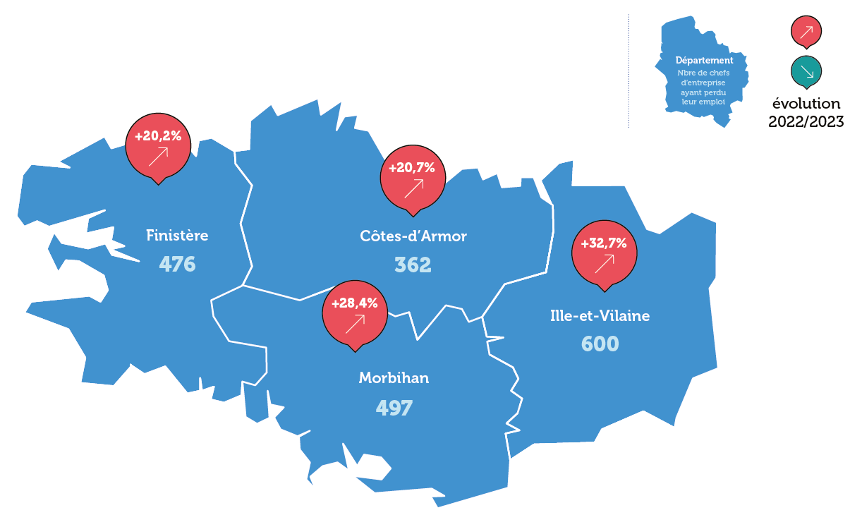 Le Finistère et les Côtes d’Armor comptabilisent respectivement 476 (+ 20,2 %) et 362 (+ 20,7 %) chefs d’entreprise ayant perdu leur activité professionnelle.