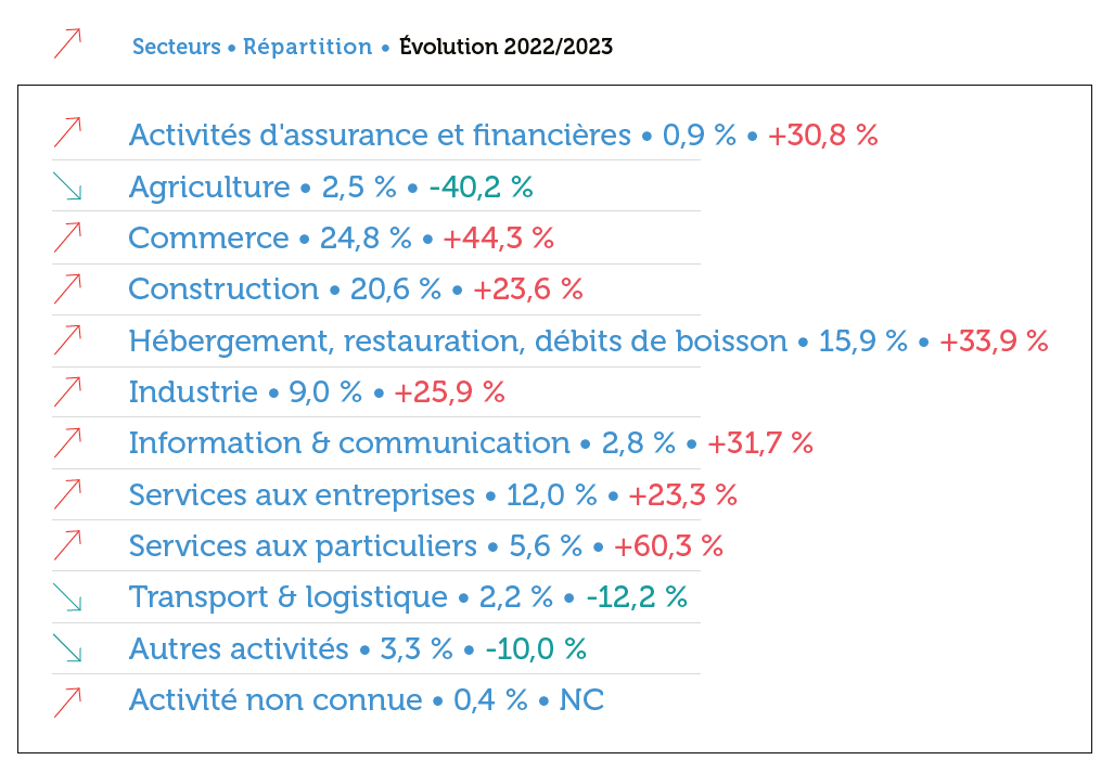 Dans le secteur de l’hébergement, restauration et débit de boissons, 308 femmes et hommes se sont retrouvés au « chômage » en 2023 (+ 33,9 %). Les activités de restauration concentrent plus des trois-quarts des chefs d’entreprise impactés du secteur.