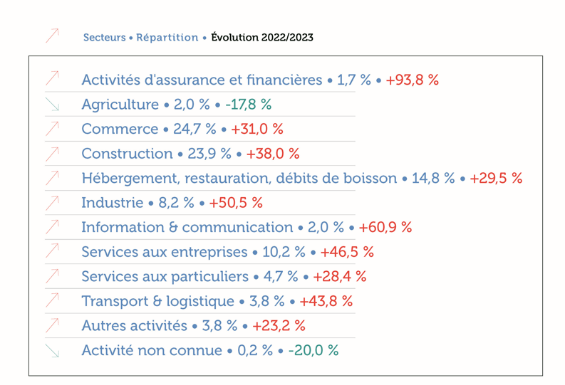 Dans le secteur de l’hébergement, restauration et débit de boissons, 268 femmes et hommes se sont retrouvés au « chômage » en 2023 (+ 29,5 %). Les activités de restauration concentrent près des trois-quarts des chefs d’entreprise impactés du secteur.