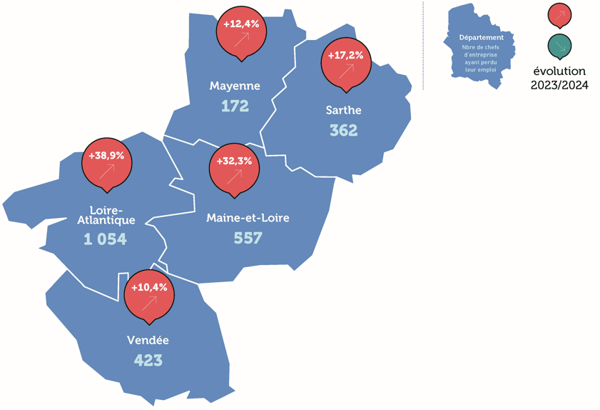 La Loire-Atlantique est le département le plus touché, avec 1 054 chefs d’entreprise ayant perdu leur emploi, soit une hausse de 38,9 %.