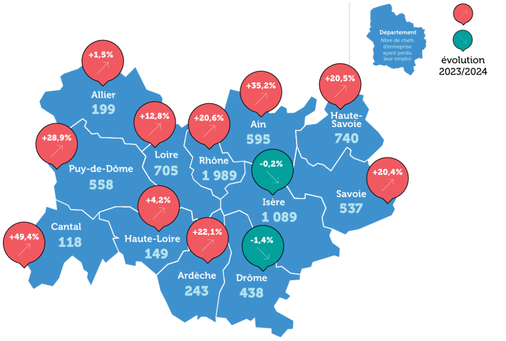 Le Rhône est le département le plus touché, avec 1 989 chefs d’entreprise ayant perdu leur emploi, soit une hausse de 20,6 % suivi par l’Isère avec 1 089 dirigeants impactés.