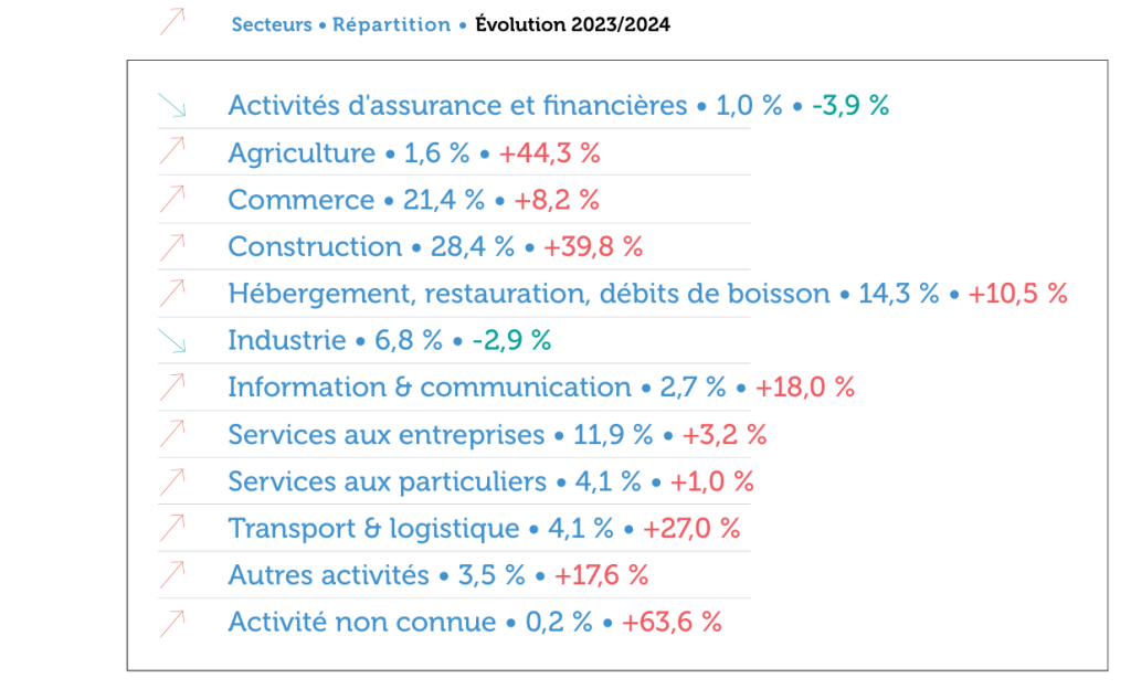 Dans le secteur de l’hébergement, restauration et débit de boissons, 1 055 femmes et hommes se sont retrouvés au « chômage » en 2024 (+ 10,5 %). Les activités de restauration concentrent plus des deux-tiers des chefs d’entreprise impactés du secteur.