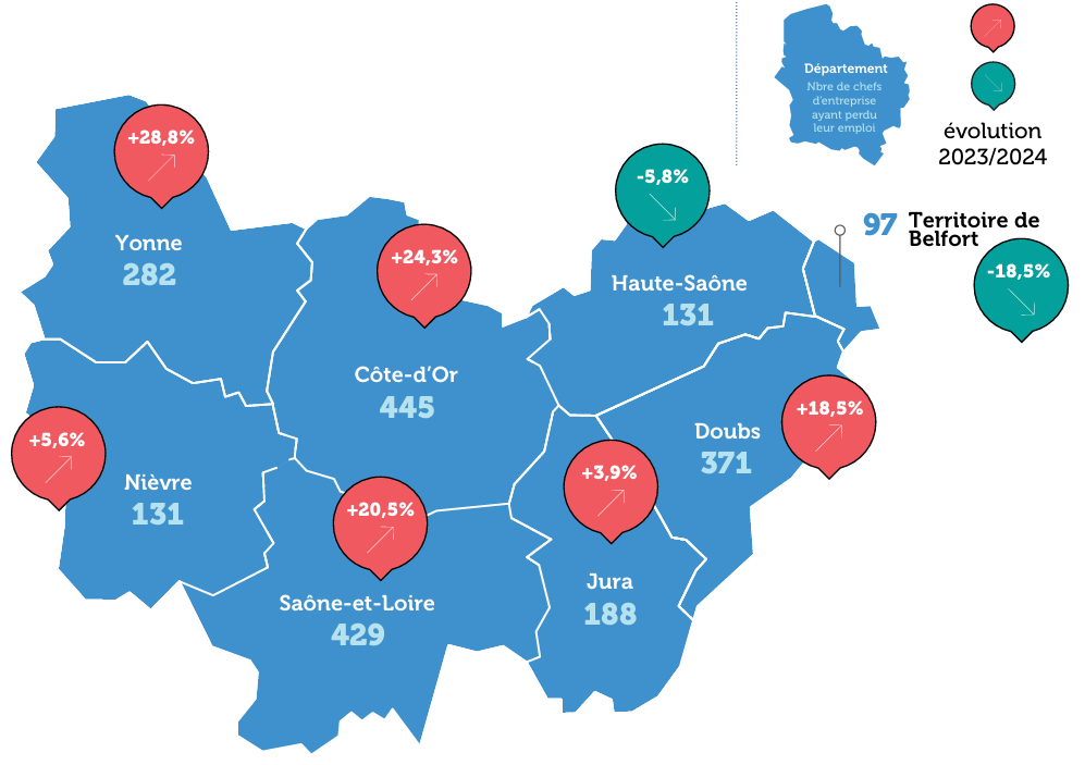 La Côte-d’Or est le département le plus touché, avec 445 chefs d’entreprise ayant perdu leur emploi, soit une hausse de 24,3 %.