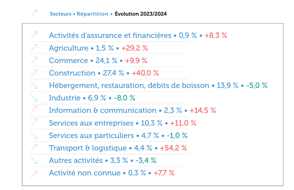 Dans le secteur de l’hébergement, restauration et débits de boissons, 586 femmes et hommes se sont retrouvés au « chômage » en 2024, soit un recul de – 5,0 %. Les activités de restauration concentrent plus des deux-tiers des chefs d’entreprise impactés du secteur.