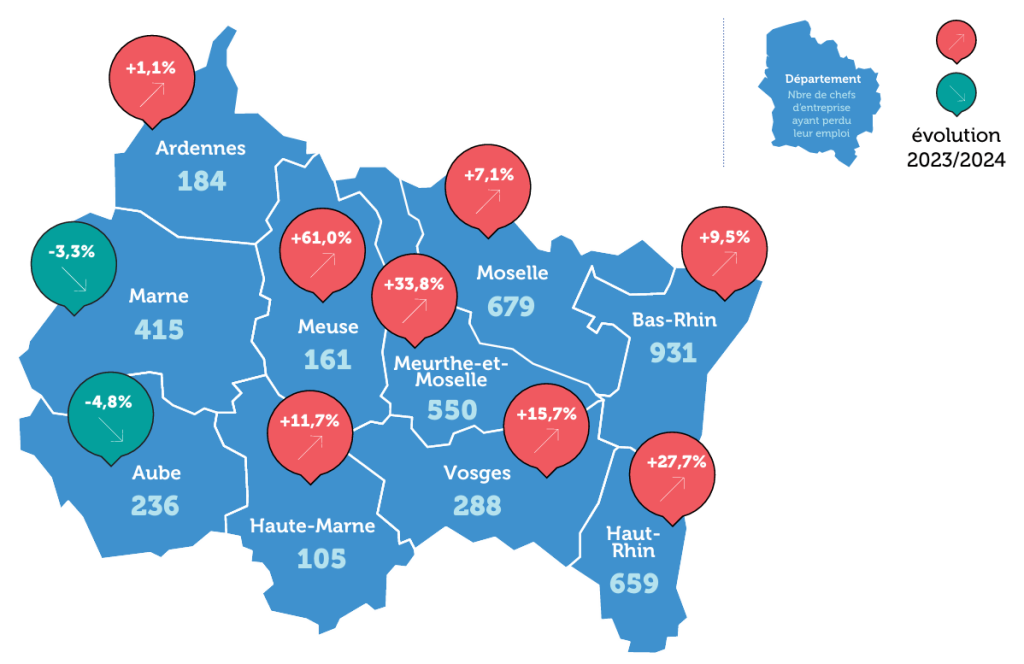 Le Bas-Rhin est le département le plus touché, avec 931 chefs d’entreprise ayant perdu leur emploi, soit une hausse de 9,5 %.  En Moselle, 679 entrepreneurs sont concernés (+ 7,1 %).