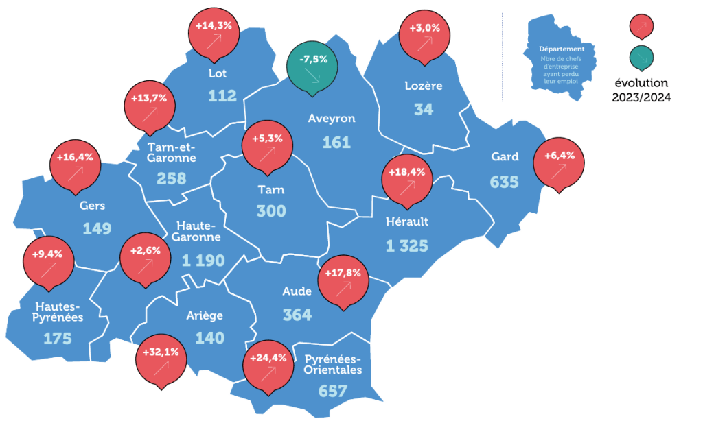 L’Hérault est le département le plus touché, avec 1 325 chefs d’entreprise ayant perdu leur emploi, soit une hausse de 18,4 %. En Haute-Garonne, 1 190 entrepreneurs sont concernés (+ 2,6 %).