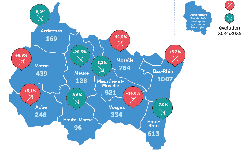 Le Bas-Rhin est le territoire le plus touché, avec 1 007 chefs d’entreprise ayant perdu leur emploi (+ 8,2 %). Deux autres départements connaissent également de fortes difficultés : les Vosges et la Moselle. Ils enregistrent les hausses les plus sévères avec respectivement + 16,0 % (334) et + 15,5 % (784). La Marne (+ 5,8 % ; 439) et l’Aube (+ 5,1 % ; 248) affichent aussi une hausse du nombre de dirigeants se retrouvant sans activité.