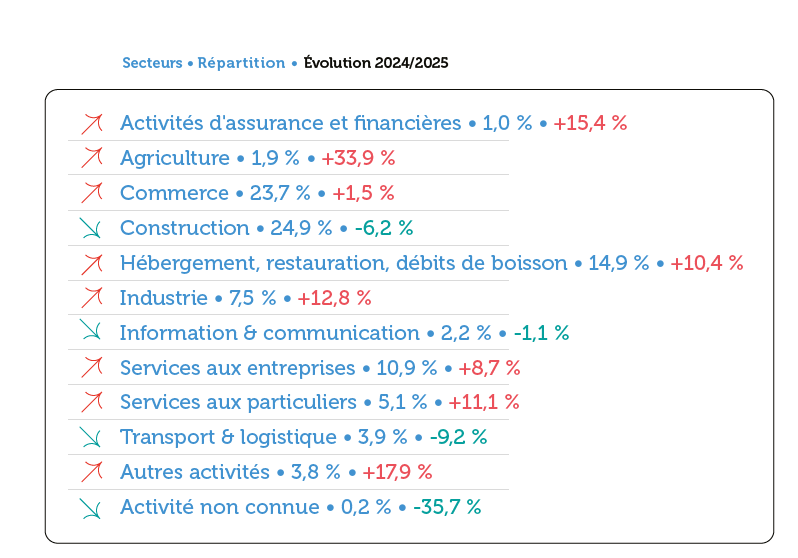 Le secteur industriel reste sous pression (+ 12,8 %) mais la situation apparaît finalement un peu moins alarmante que prévu alors que l’on pouvait craindre de très fortes difficultés pour ces métiers.