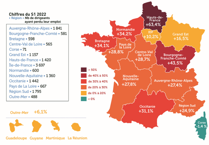 La région des Hauts-de-France est la plus en souffrance. Ils sont 1 420 dirigeants à avoir perdu leur emploi au 1er semestre 2022 contre 869 au 1er semestre 2021 (+ 63,4 %). Tous les dirigeants, quels que soient la taille, le chiffre d’affaires ou encore la forme juridique de l’entreprise sont impactés sur ce territoire.