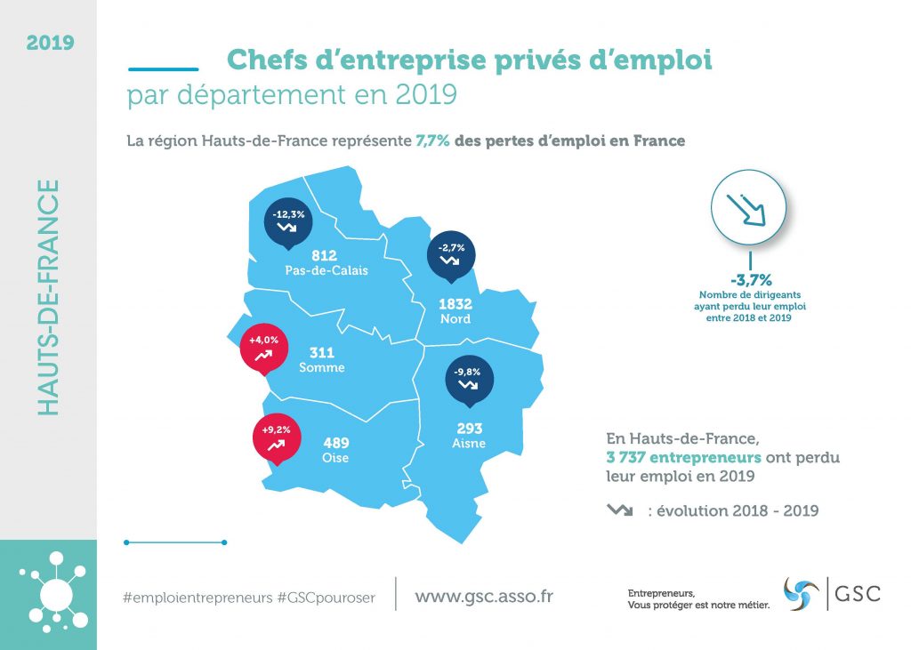 La crise sanitaire que traverse actuellement la France bouleverse l’économie du pays et met en péril de nombreuses entreprises et dirigeants. Selon l’Observatoire de l’emploi des entrepreneurs réalisé par l’association GSC et la société Altares, déjà 3 737 femmes et hommes chefs d’entreprise de la région Hauts-de-France avaient perdu leur emploi en 2019. Cette situation alarmante risque de devenir dramatique pour l’année 2020.