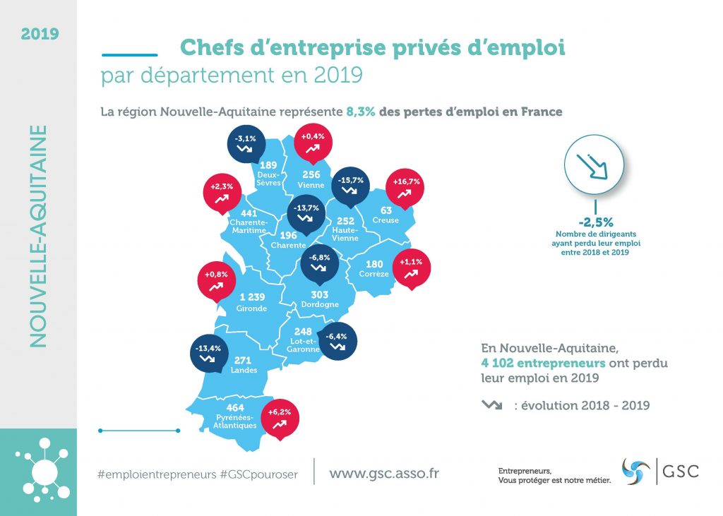 La crise sanitaire que traverse actuellement la France bouleverse l’économie du pays et met en péril de nombreuses entreprises et dirigeants. Selon l’Observatoire de l’emploi des entrepreneurs réalisé par l’association GSC et la société Altares, déjà 4 102 femmes et hommes chefs d’entreprise de la région Nouvelle-Aquitaine avaient perdu leur emploi en 2019. Cette situation alarmante risque de devenir dramatique pour l’année 2020.
