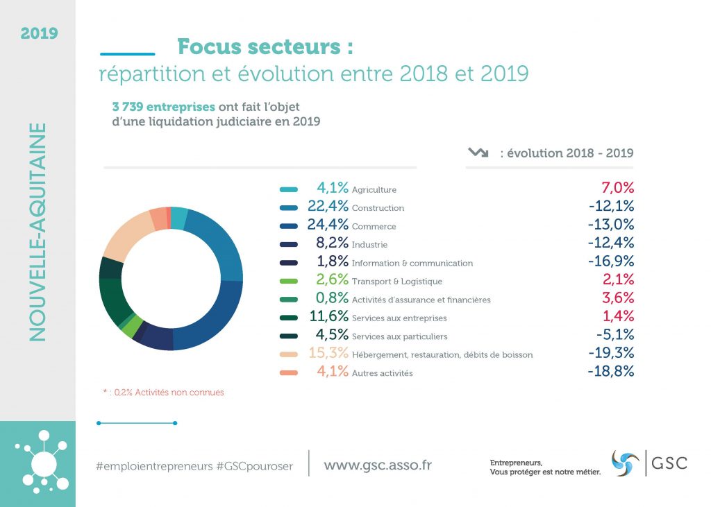 Alors que l’âge médian des dirigeants impactés en Nouvelle-Aquitaine s’établit à 46,9 ans en 2019, les effets dévastateurs du COVID-19 laissent penser que toutes les tranches d’âges seront impactées cette année. Les secteurs les plus touchés en 2019 dans la région comme la construction, le commerce et l’hébergement, restauration et débits de boissons devront également faire face à de nouvelles difficultés en 2020. Depuis le 15 mars, de nombreux dirigeants ont dû fermer leur établissement ou mettre leur activité à l’arrêt laissant présager des situations financières dramatiques qui pourront engendrer des liquidations judiciaires. Ces secteurs représentaient déjà plus de la moitié des pertes d’emploi en Nouvelle-Aquitaine en 2019 avec 850 entreprises impactées dans le commerce, 796 sociétés liquidées dans la construction et 539 dans le secteur de l’hébergement, restauration et débits de boissons.
