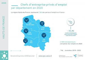 Observatoire 2020 dans les Hauts-de-France : l’association GSC et la société Altares dévoilent la 5ème édition de l’Observatoire de l’emploi des entrepreneurs. En 2020, 2 585 femmes et hommes chefs d’entreprise ont perdu leur activité professionnelle en Hauts-de-France. Les mesures prises par le gouvernement dans le cadre de la crise de la COVID-19 ont protégé temporairement les dirigeants de la faillite. Malgré une diminution de 33,4 %, ce territoire reste fortement impacté par le chômage des entrepreneurs.