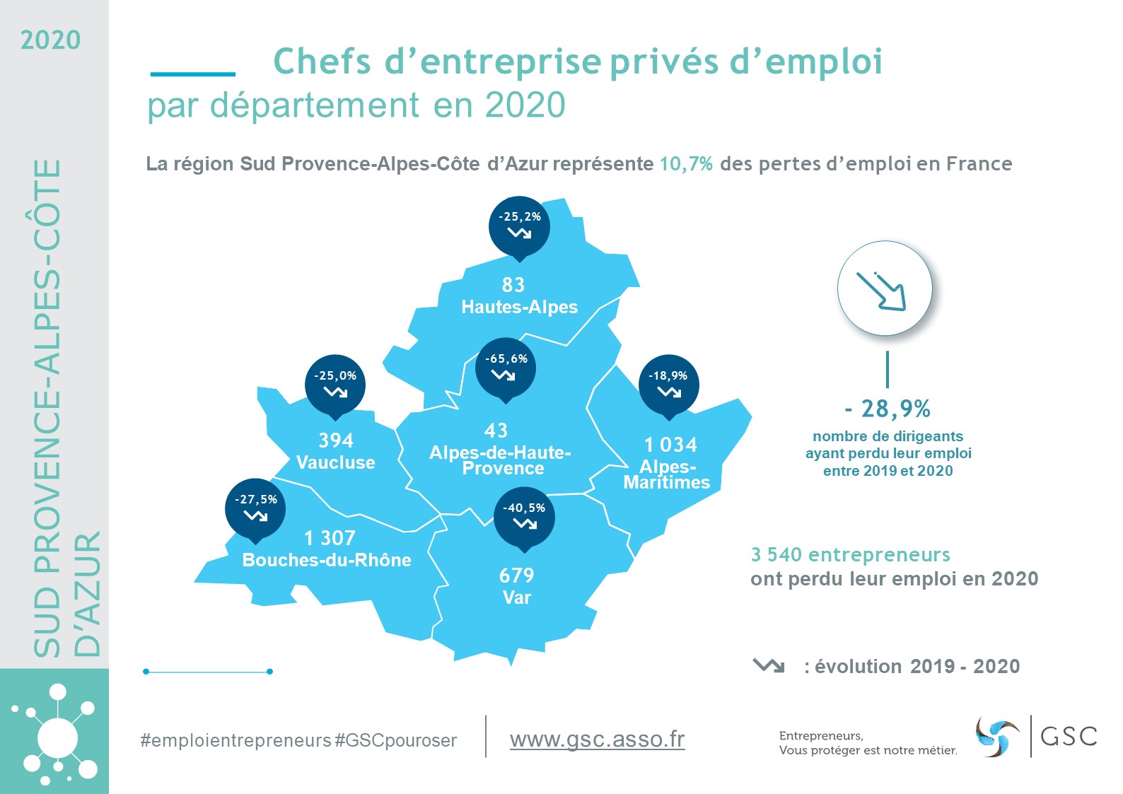 Dans trois autres départements la baisse des pertes d’emploi des dirigeants est supérieure à 25 % : Var (679 ; – 40,5 %), Hautes-Alpes (83 ; – 25,2 %), Vaucluse (394 ; – 25 %).
