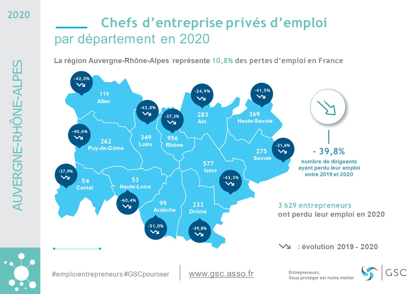Dans quatre autres départements la baisse des pertes d’emploi des dirigeants est supérieure à la moyenne régionale : Loire (349 ; – 43,8 %), Allier (119 ; – 42 %), Haute-Savoie (369 ; – 41,5 %), Drôme (233 ; – 39,8 %),